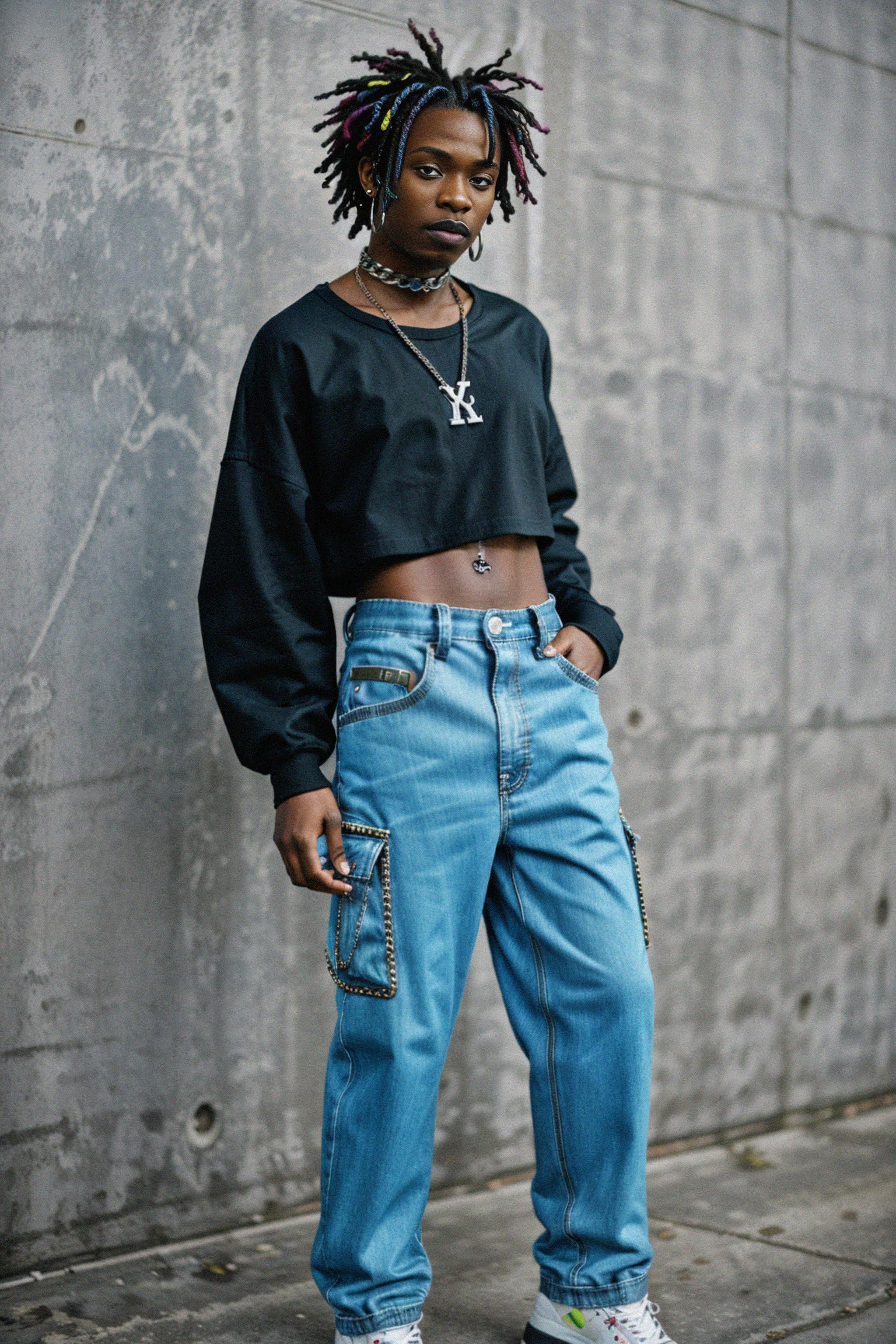 model wearing Y2K aesthetic, 2000s fashion, aughts style, noughties style, grunge or 2000s style, oversized washed out style, baggy pants, low rise pants or cargo pants, crop top, Choker, Metallic, iridescent fabrics, posing for photo