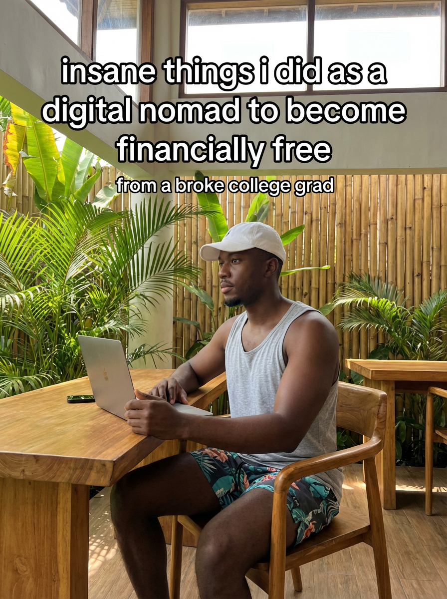 model white cap wearing swim shorts and tank top, in a balinese coworking studio, bamboo walls, lush tropical plants, sunlight pouring through high windows, vibrant tropical decor, wearing relaxed business attire, thoughtful expression, soft natural lighting, candid workspace vibe. TikTok-style text overlay with white text with black outline: "insane things i did as a digital nomad to become financially free" and small letters below "(from a broke college grad)", do not show tiktok interface or logo