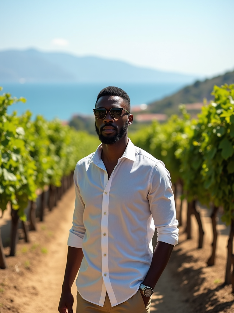 model wine tasting at a Santorini vineyard, wearing smart casual outfit with sunglasses, rows of grapevines with sea views