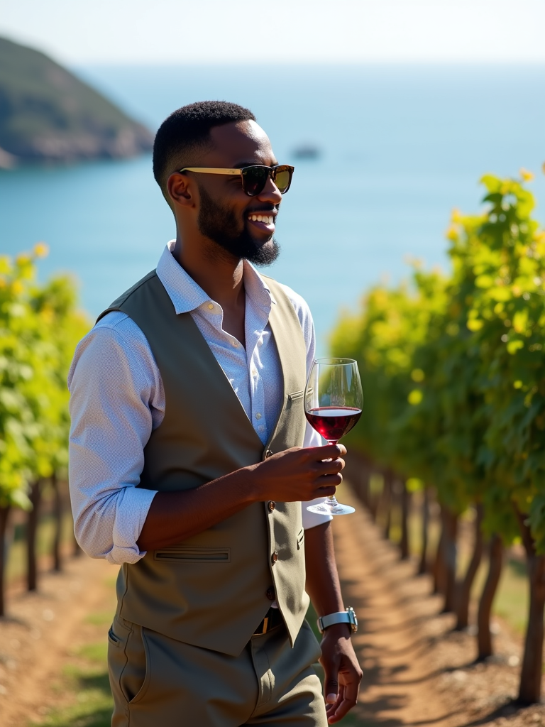 model wine tasting at a Santorini vineyard, wearing smart casual outfit with sunglasses, rows of grapevines with sea views