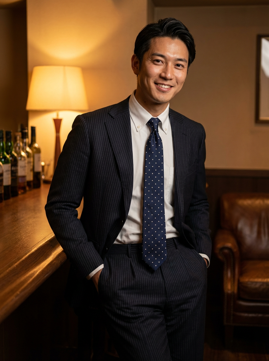 model with a seductive smile, donned in a classy tie, under warm indoor lighting