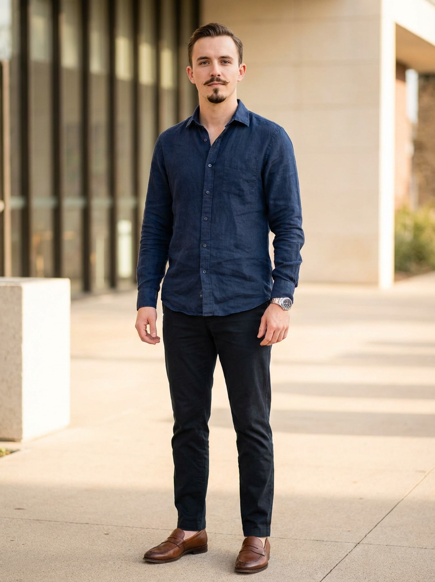 model with anchor beard, pointed chin beard with thin mustache, stylish appearance