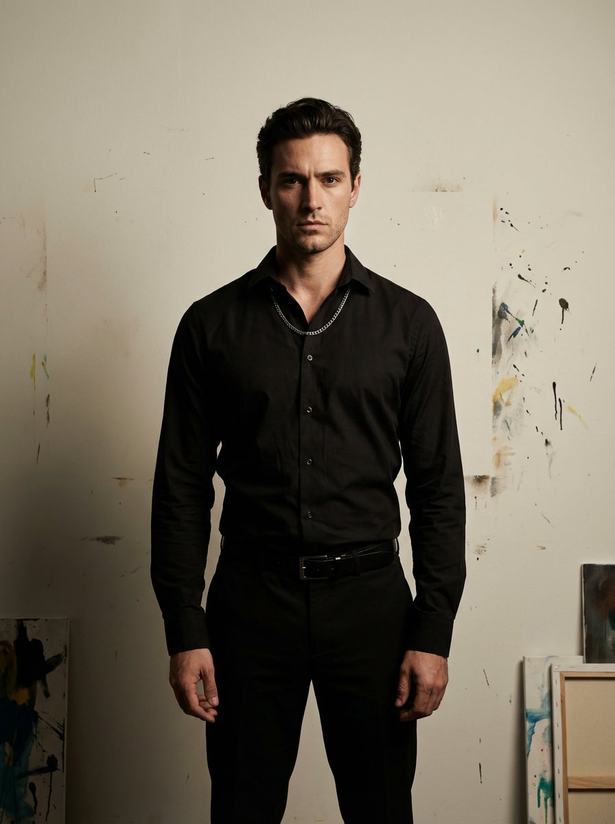 model with artistic creative expression, artistic casual look, moody artistic lighting