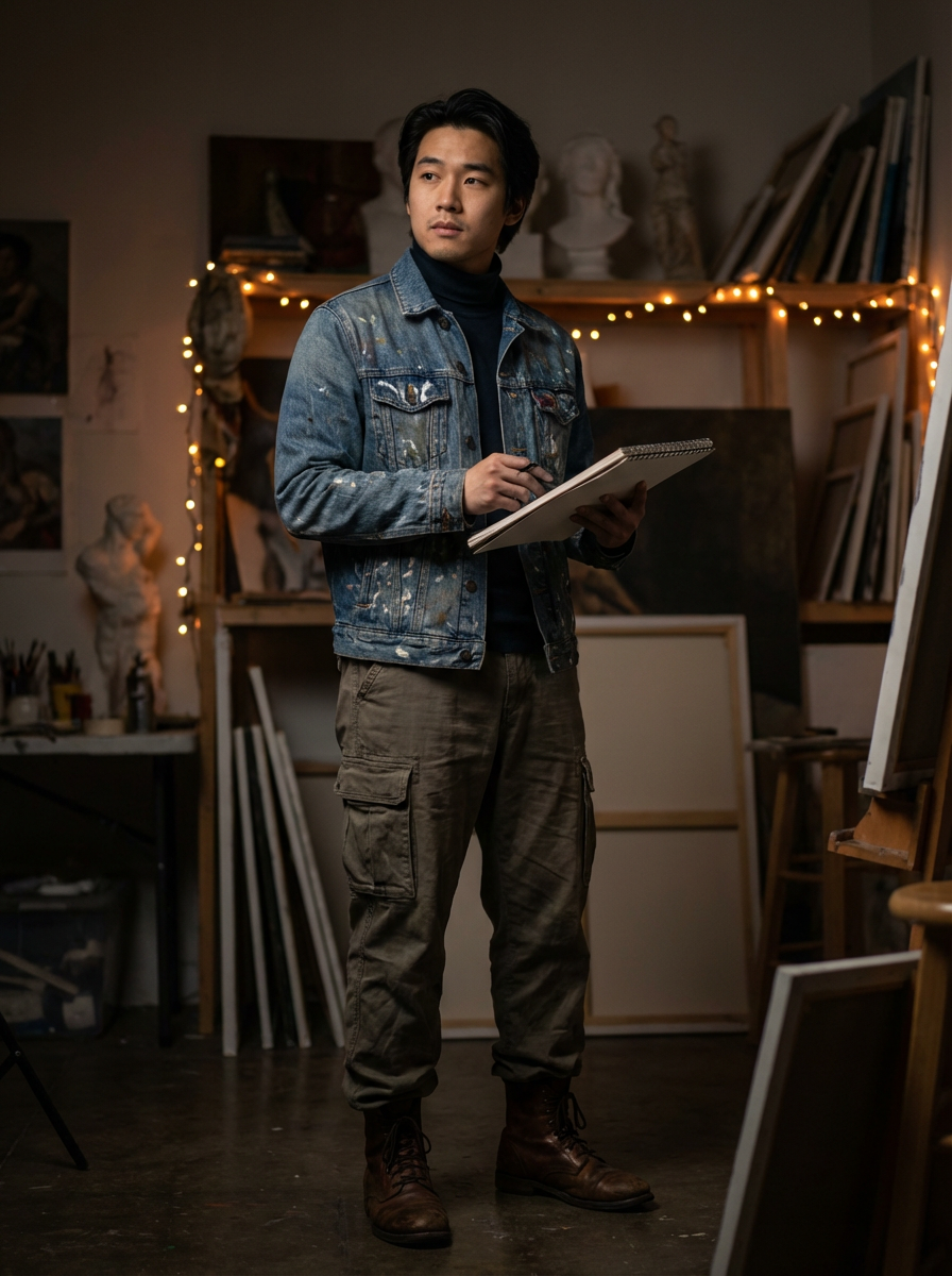 model with artistic creative expression, artistic casual look, moody artistic lighting