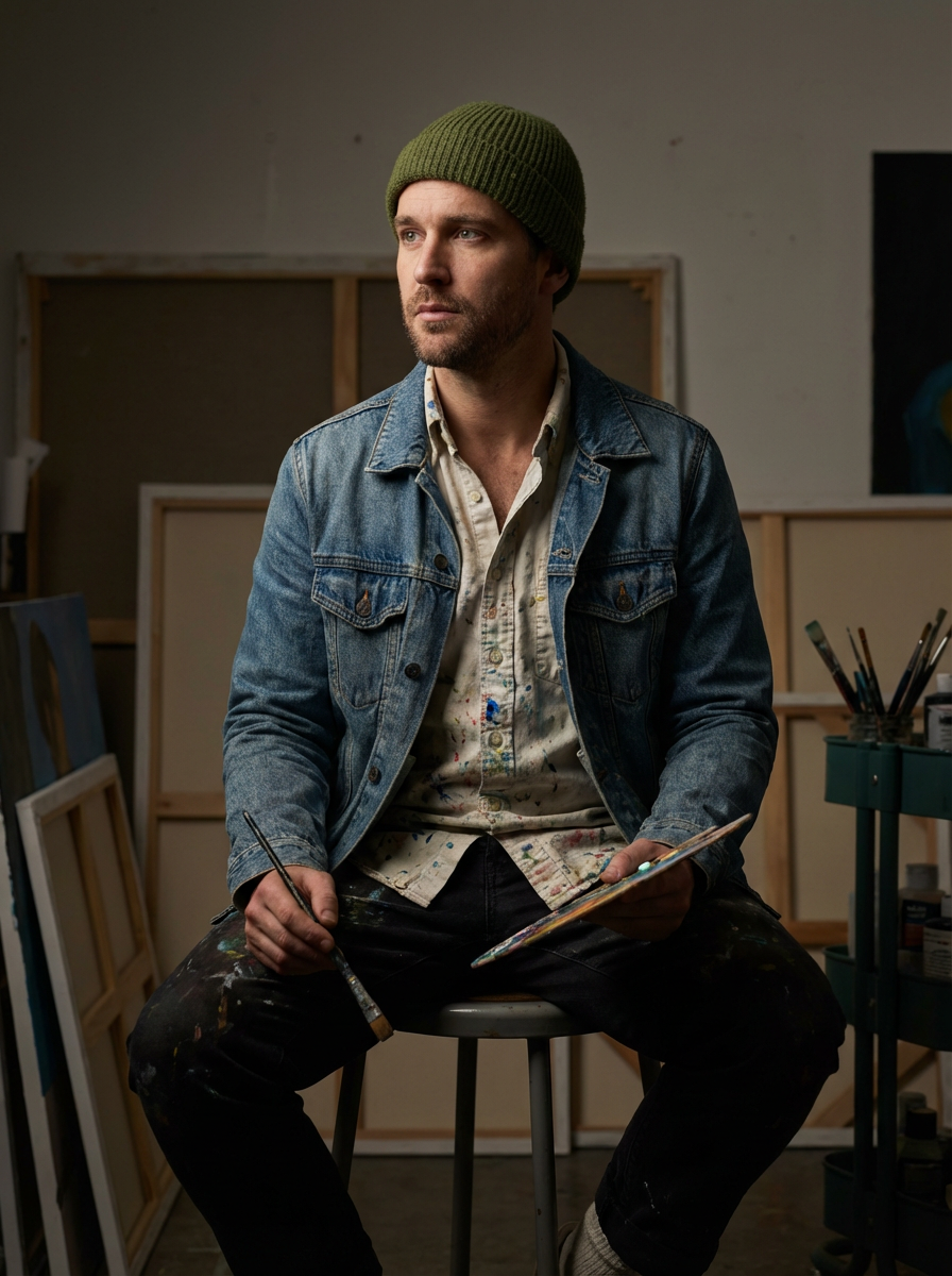 model with artistic creative expression, artistic casual look, moody artistic lighting