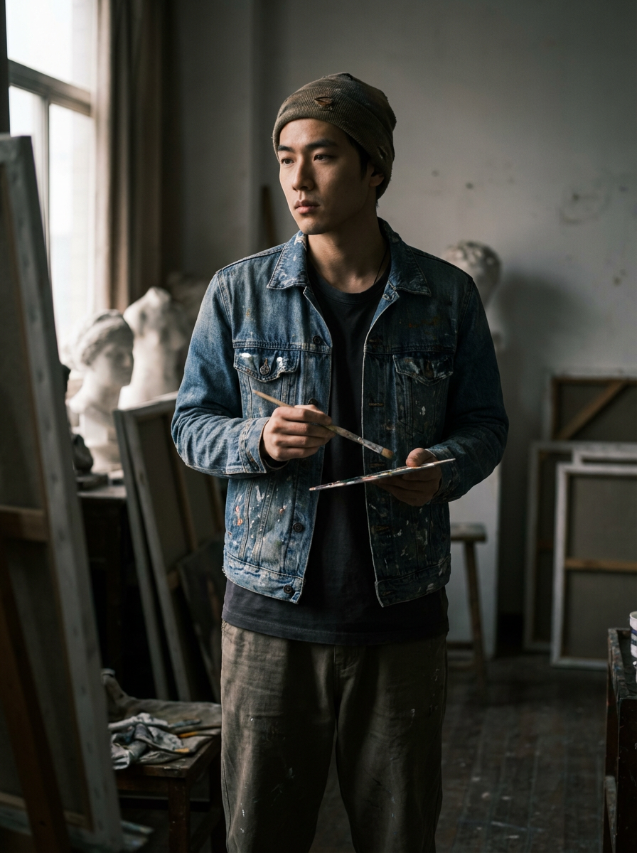 model with artistic creative expression, artistic casual look, moody artistic lighting