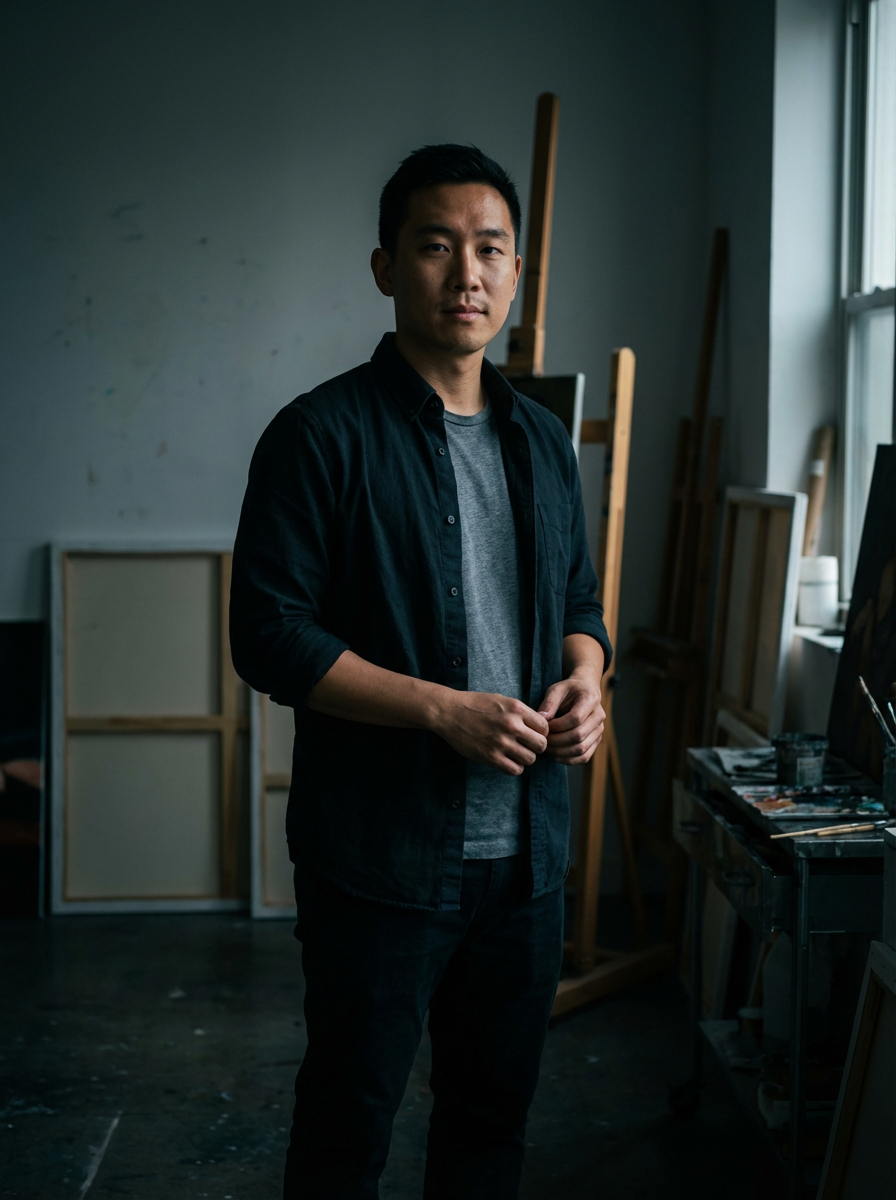 model with artistic creative expression, artistic casual look, moody artistic lighting