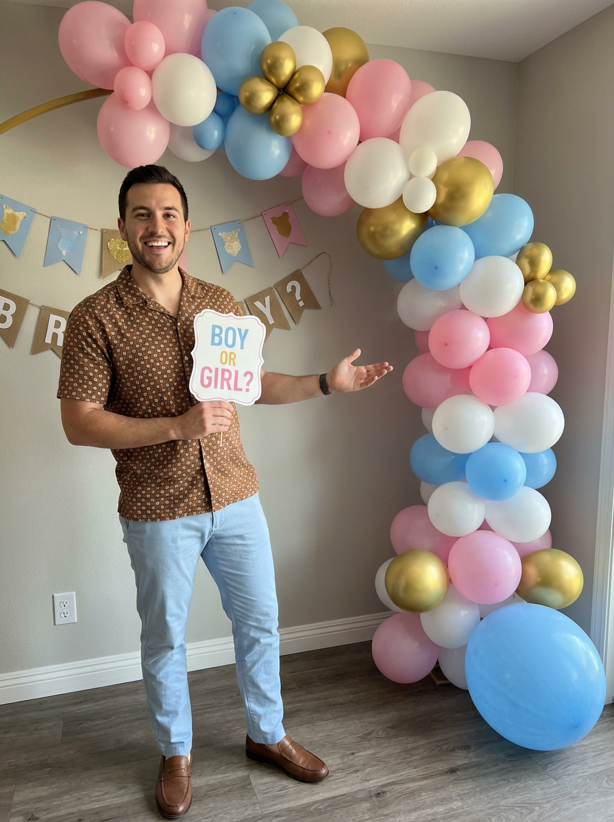 model with baby shower balloon arch, gender reveal colors, stylish maternity or parent outfit