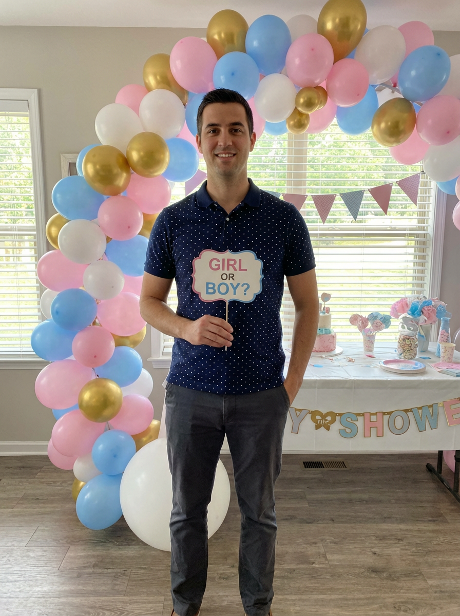 model with baby shower balloon arch, gender reveal colors, stylish maternity or parent outfit