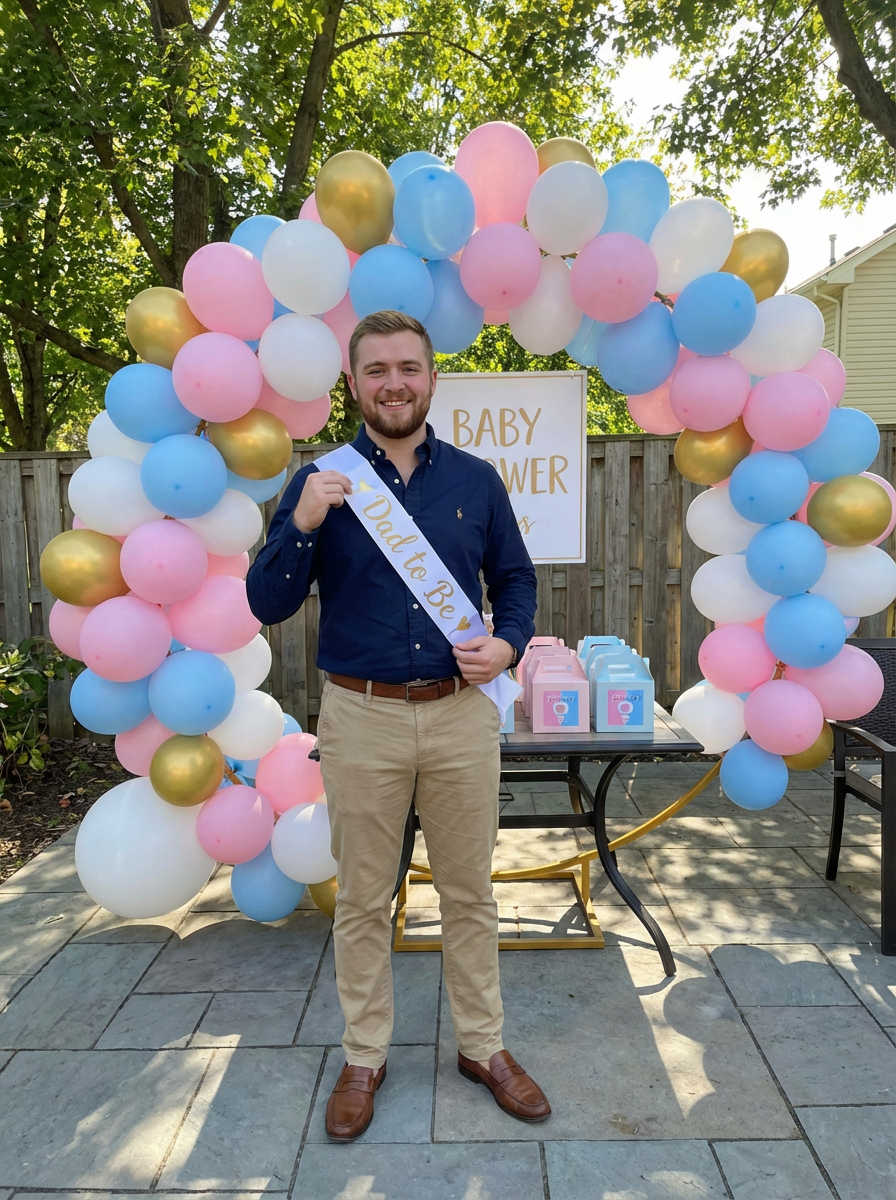 model with baby shower balloon arch, gender reveal colors, stylish maternity or parent outfit