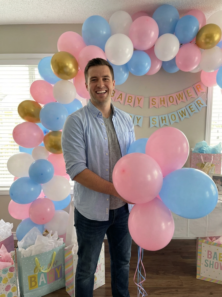 model with baby shower balloon arch, gender reveal colors, stylish maternity or parent outfit