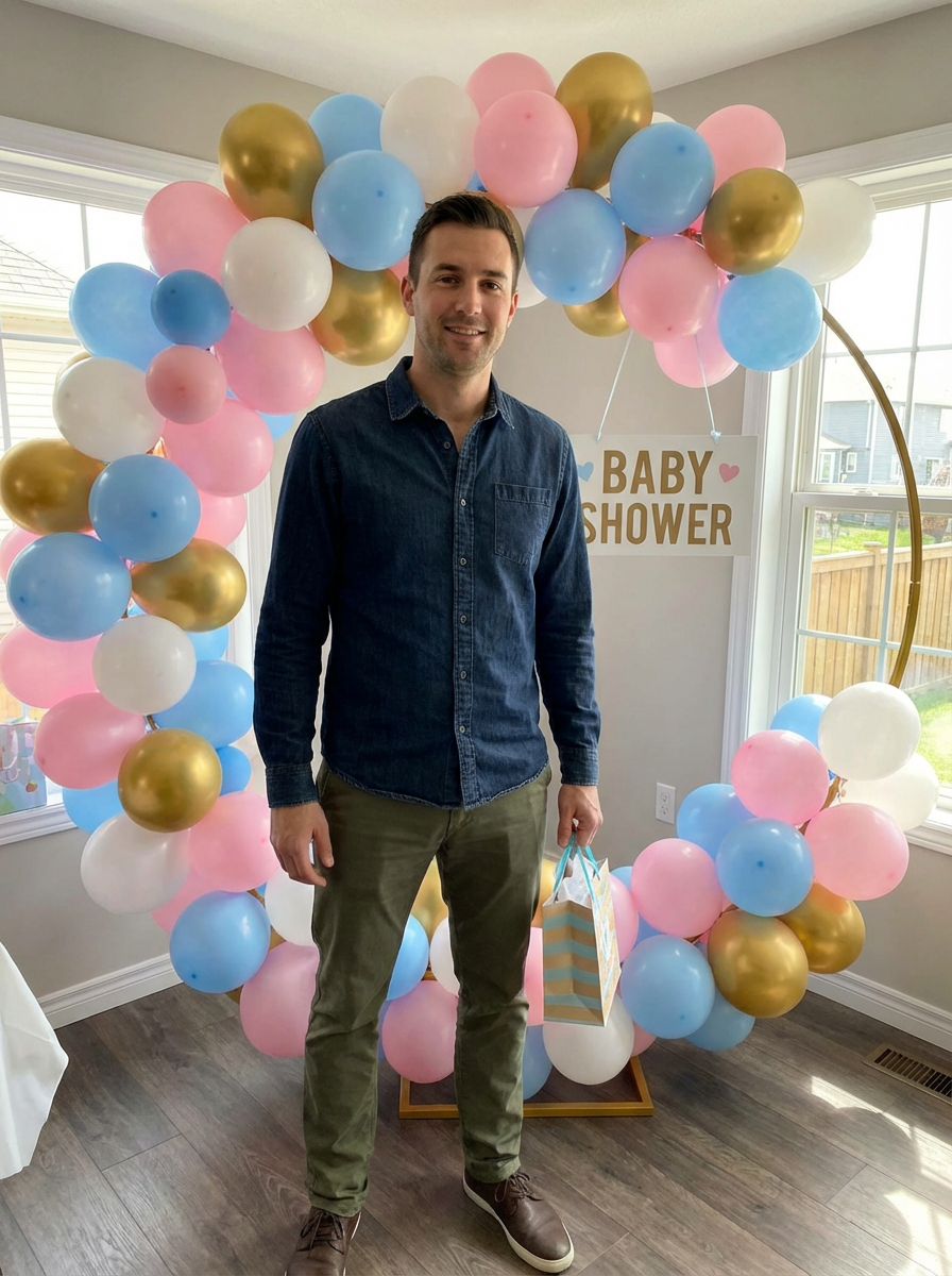 model with baby shower balloon arch, gender reveal colors, stylish maternity or parent outfit