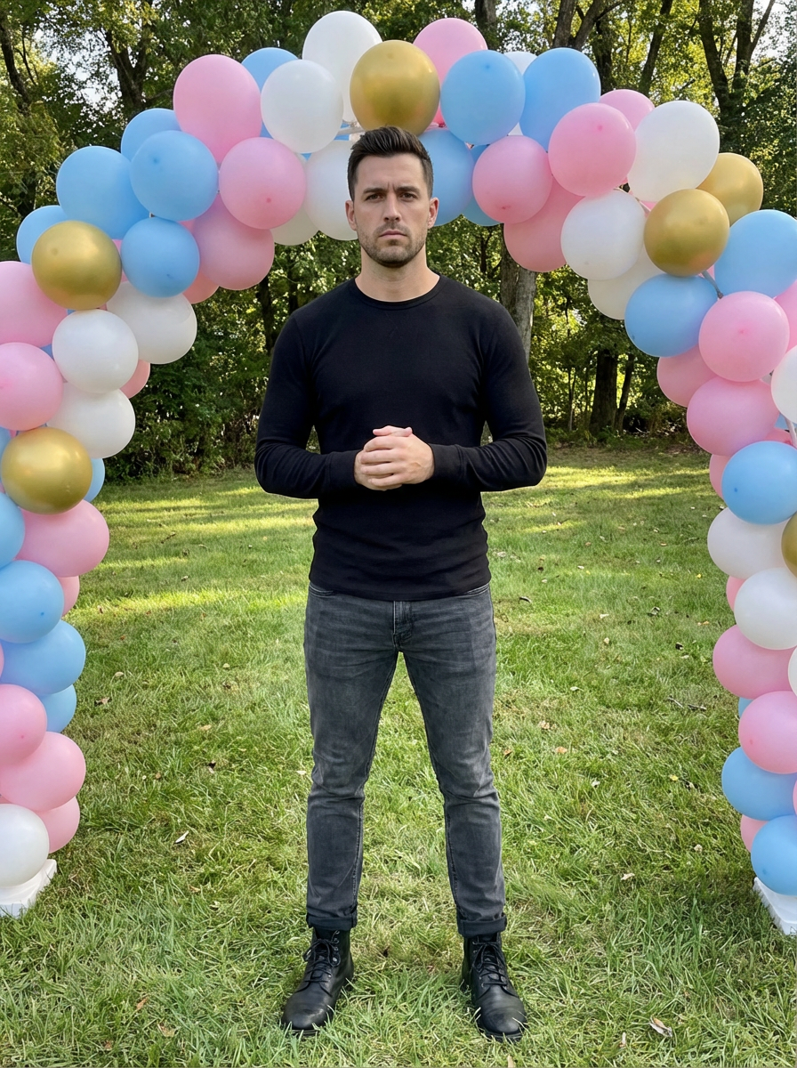 model with baby shower balloon arch, gender reveal colors, stylish maternity or parent outfit