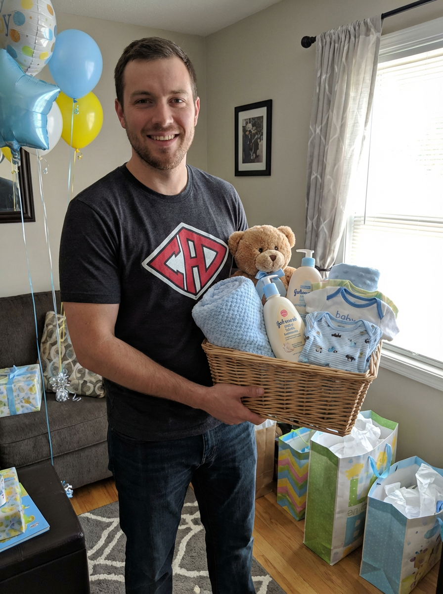model with baby shower gift basket, adorable baby items, grateful happy expression