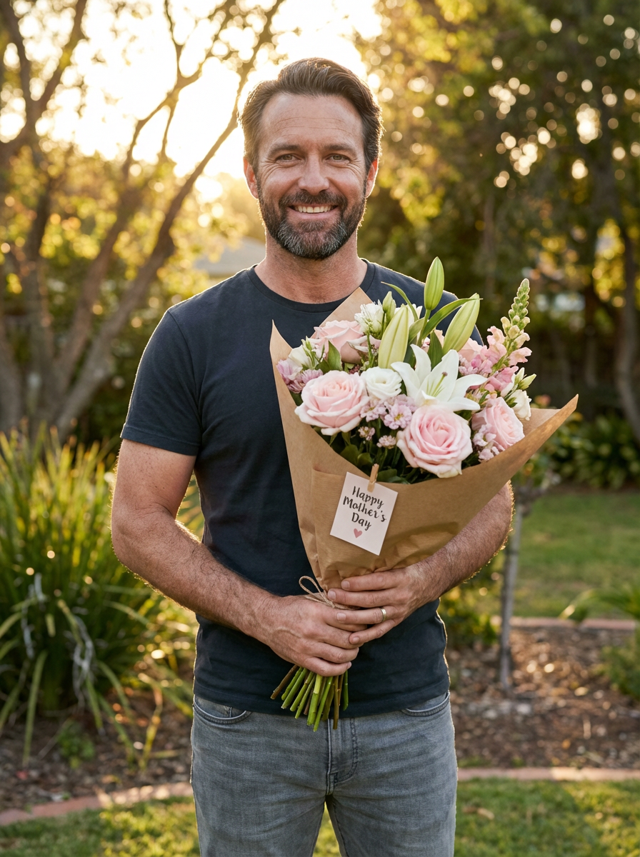 model with beautiful flower bouquet, Mothers Day gift, soft pink and white flowers, warm natural lighting, grateful expression