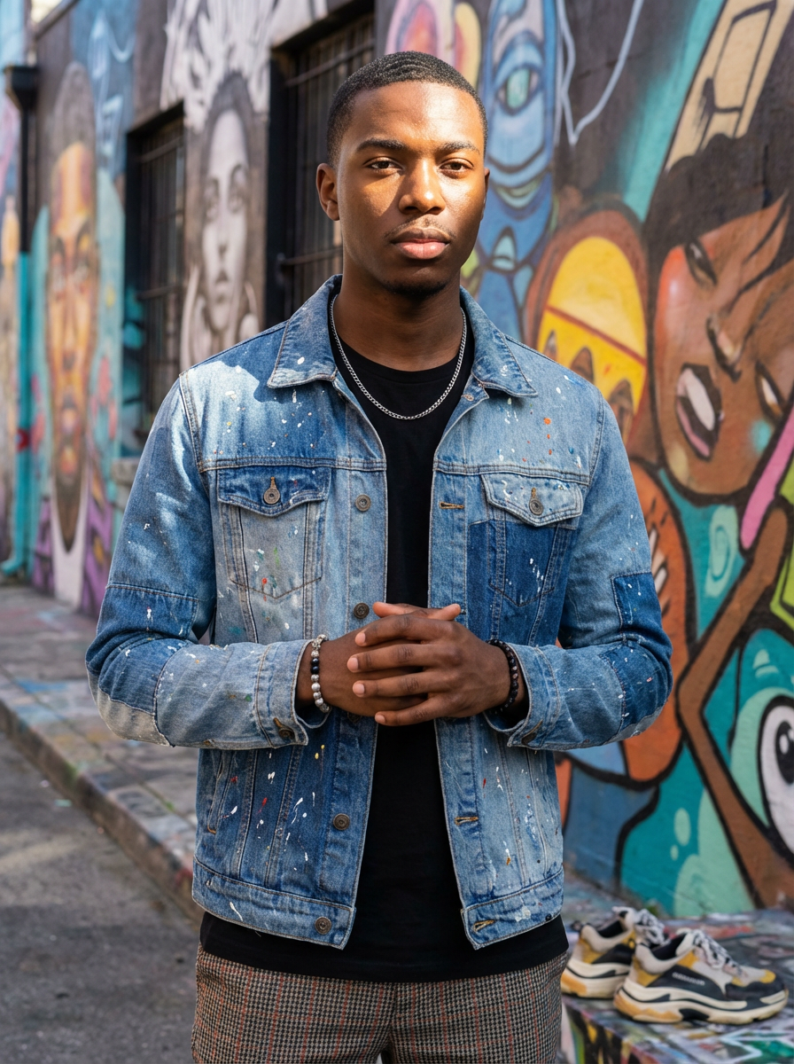 model with bold fashion choice, confident in unique style, artistic urban setting