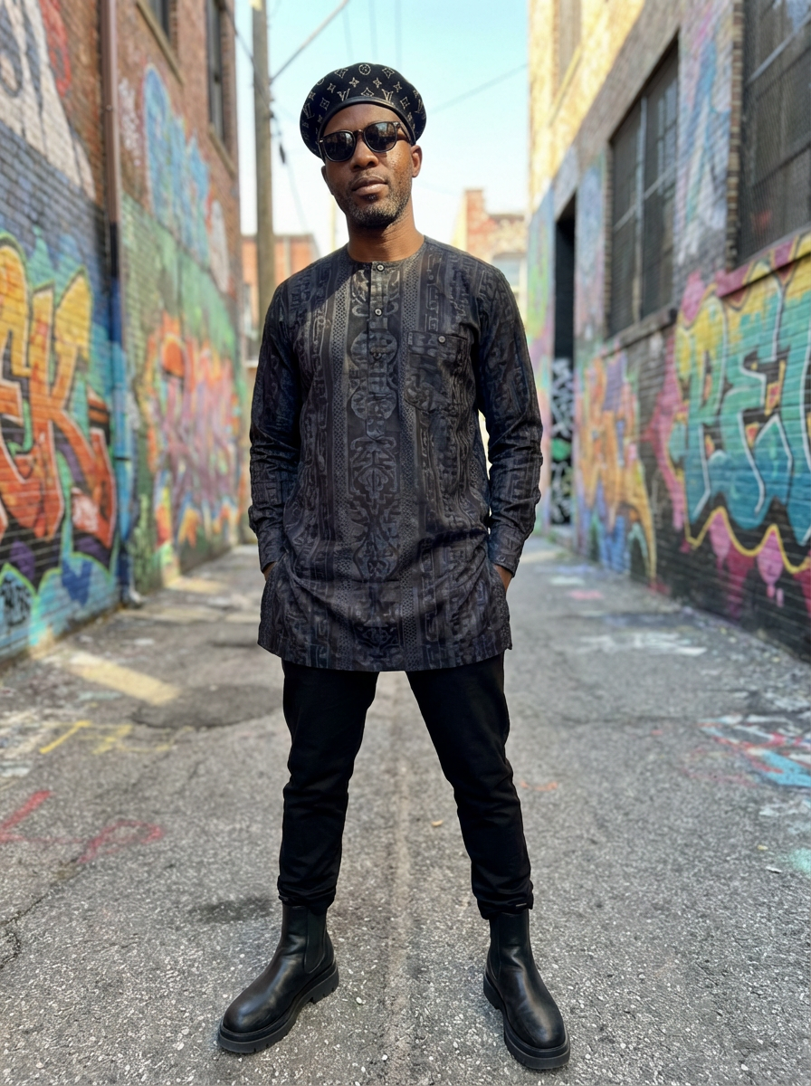 model with bold fashion choice, confident in unique style, artistic urban setting