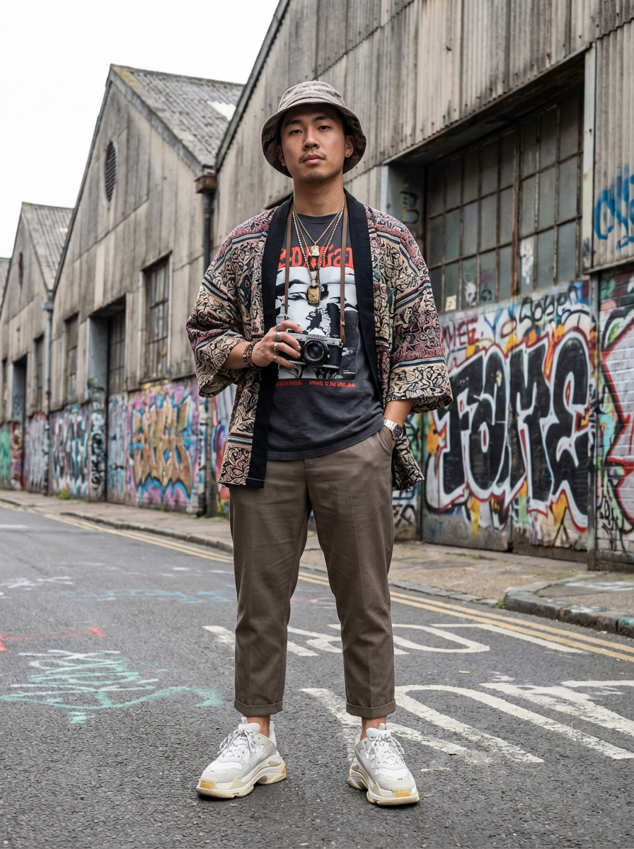 model with bold fashion choice, confident in unique style, artistic urban setting