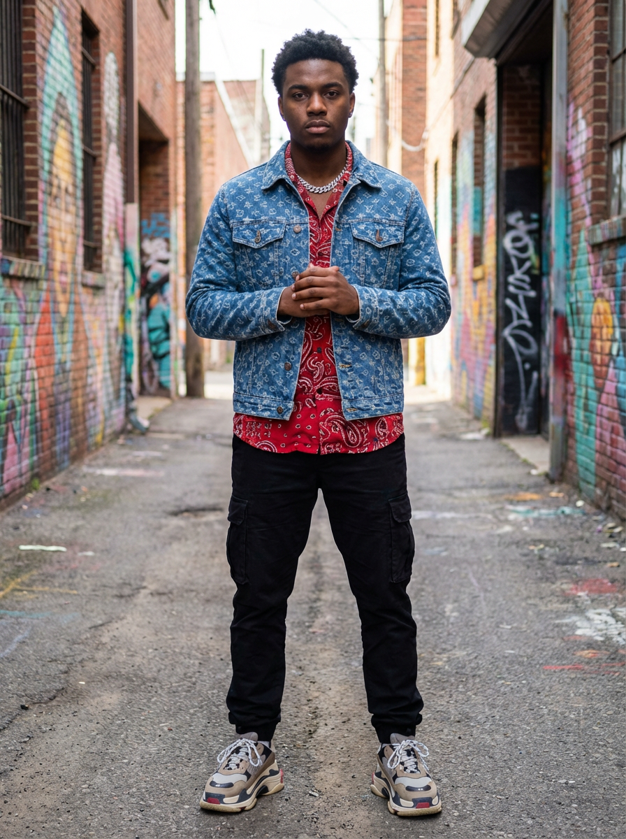model with bold fashion choice, confident in unique style, artistic urban setting