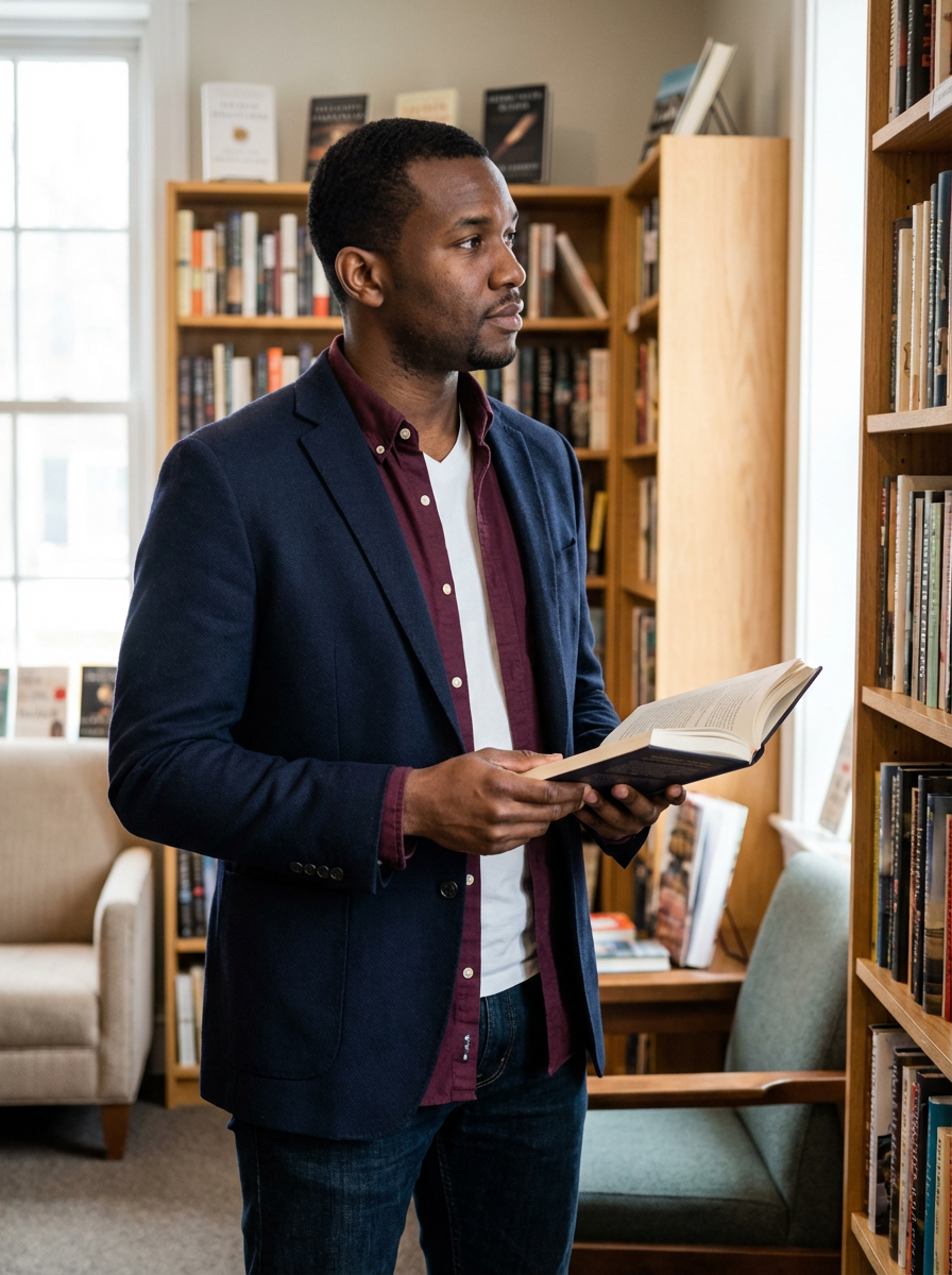 model with books or in bookstore, thoughtful expression, casual smart outfit, cozy atmosphere