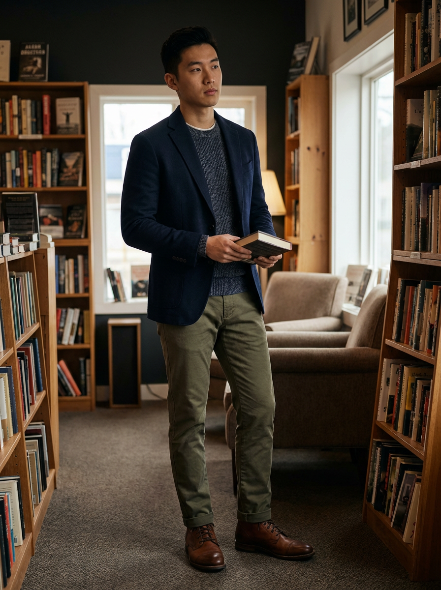 model with books or in bookstore, thoughtful expression, casual smart outfit, cozy atmosphere