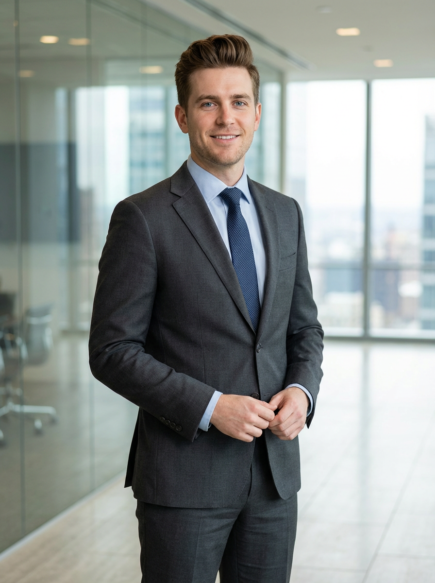 model with clean shaven face, smooth skin, fresh groomed look, professional setting
