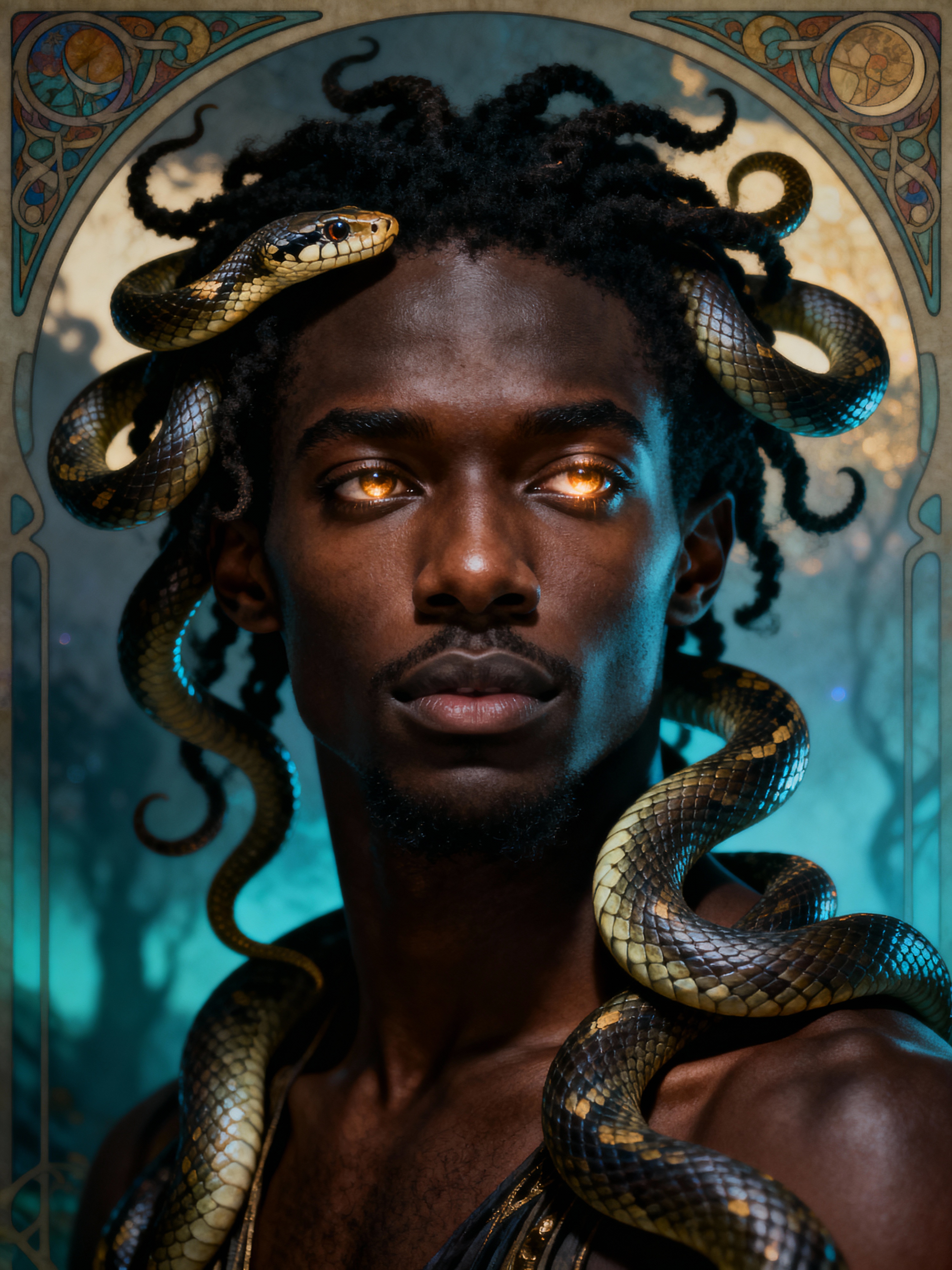 model with coiled serpents beautiful detailed romantic art nouveau of a model by alphonse mucha, kay nielsen, yoshitaka amano, and gustav klimt, hauntingly beautiful refined moody dreamscape