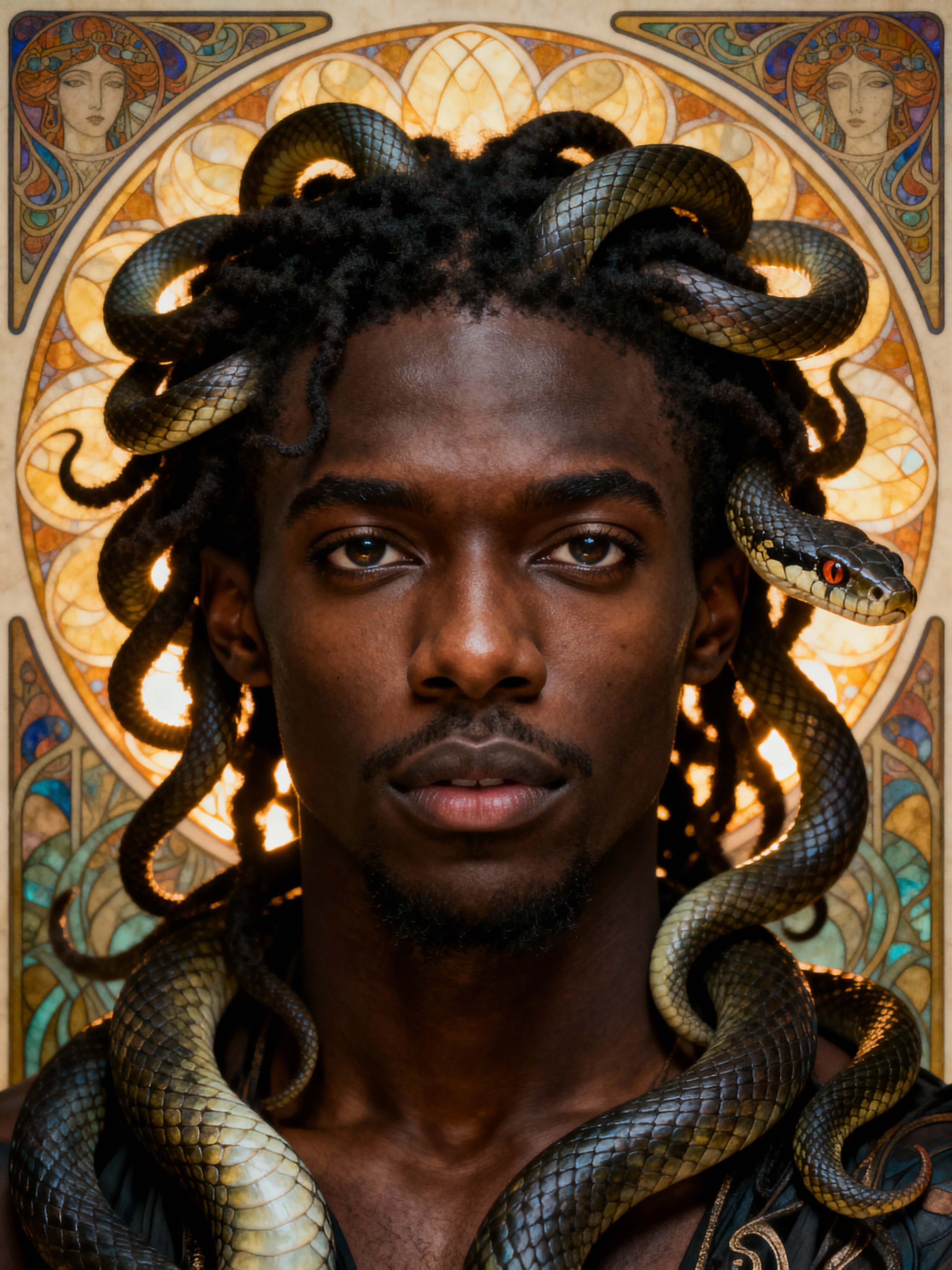 model with coiled serpents beautiful detailed romantic art nouveau of a model by alphonse mucha, kay nielsen, yoshitaka amano, and gustav klimt, hauntingly beautiful refined moody dreamscape
