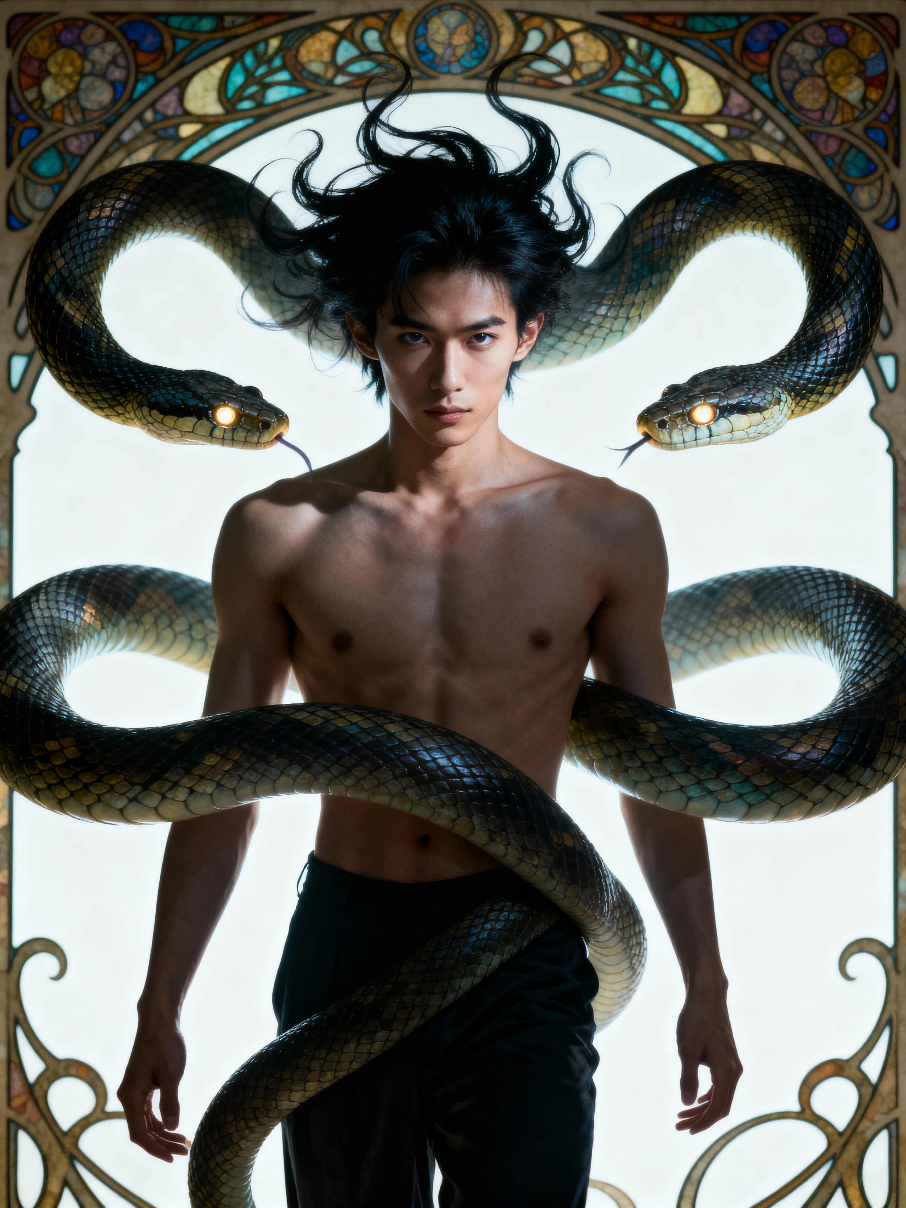 model with coiled serpents beautiful detailed romantic art nouveau of a model by alphonse mucha, kay nielsen, yoshitaka amano, and gustav klimt, hauntingly beautiful refined moody dreamscape