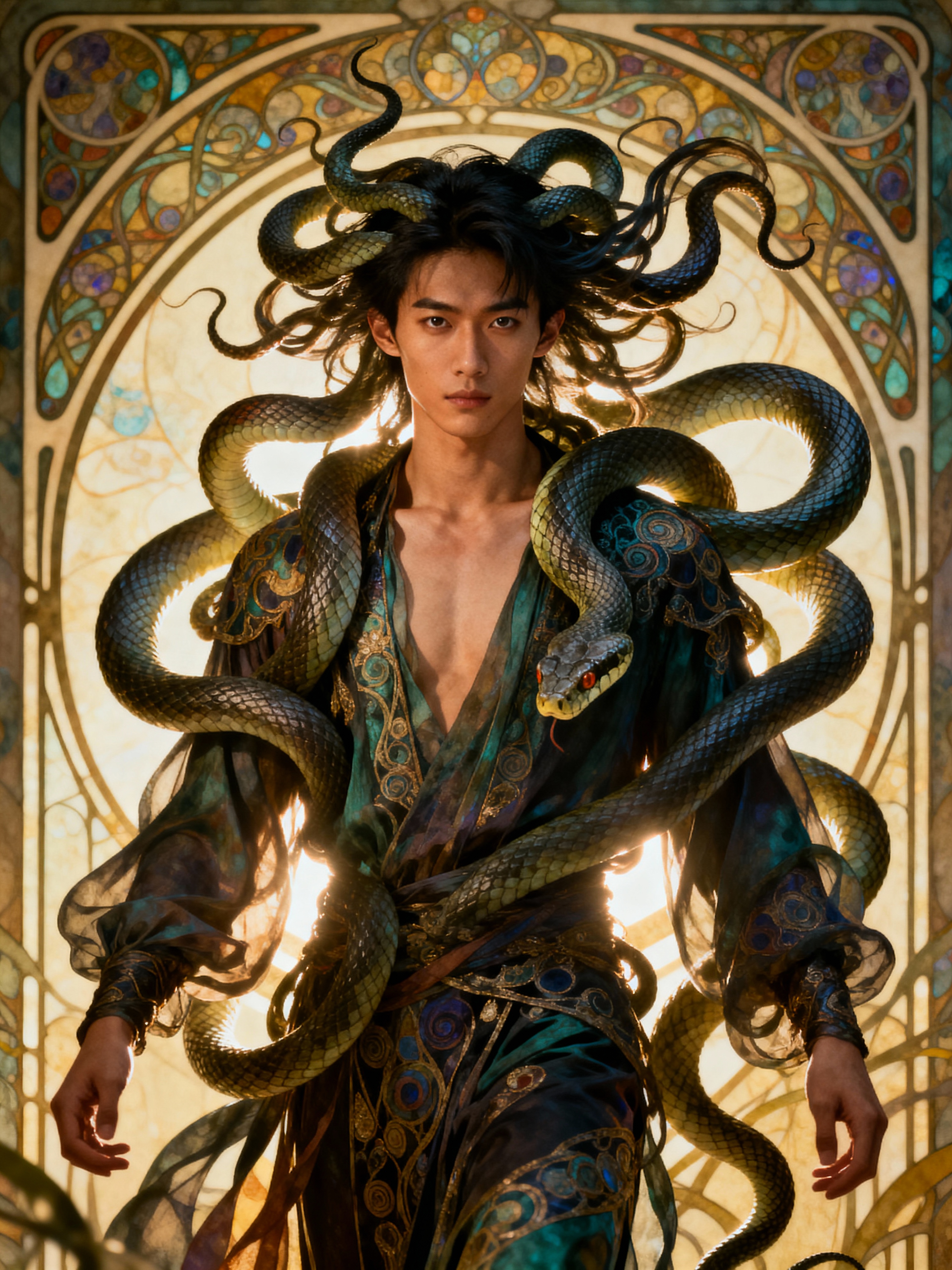 model with coiled serpents beautiful detailed romantic art nouveau of a model by alphonse mucha, kay nielsen, yoshitaka amano, and gustav klimt, hauntingly beautiful refined moody dreamscape