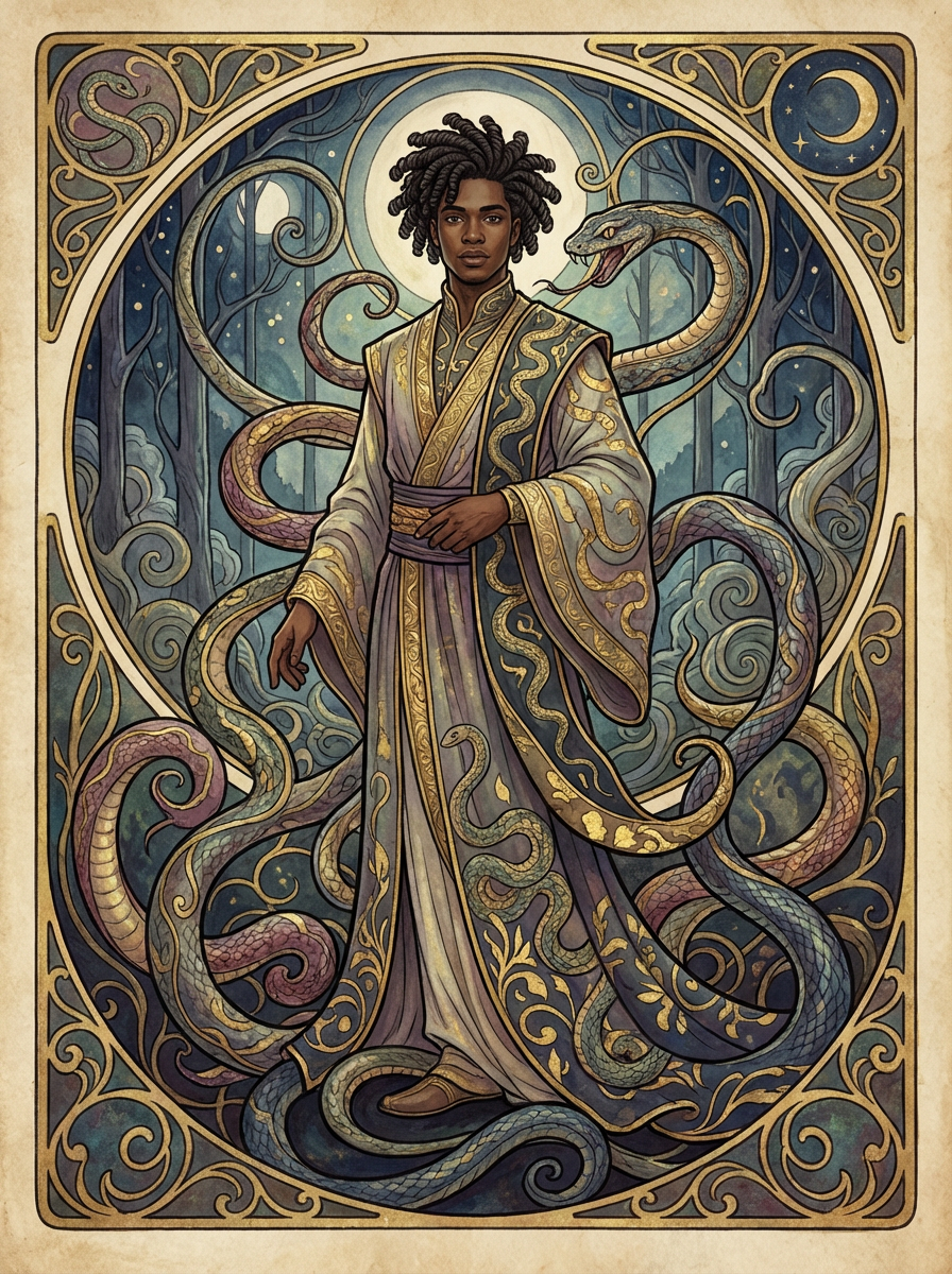 model with coiled serpents beautiful detailed romantic art nouveau of a model by alphonse mucha, kay nielsen, yoshitaka amano, and gustav klimt, hauntingly beautiful refined moody dreamscape