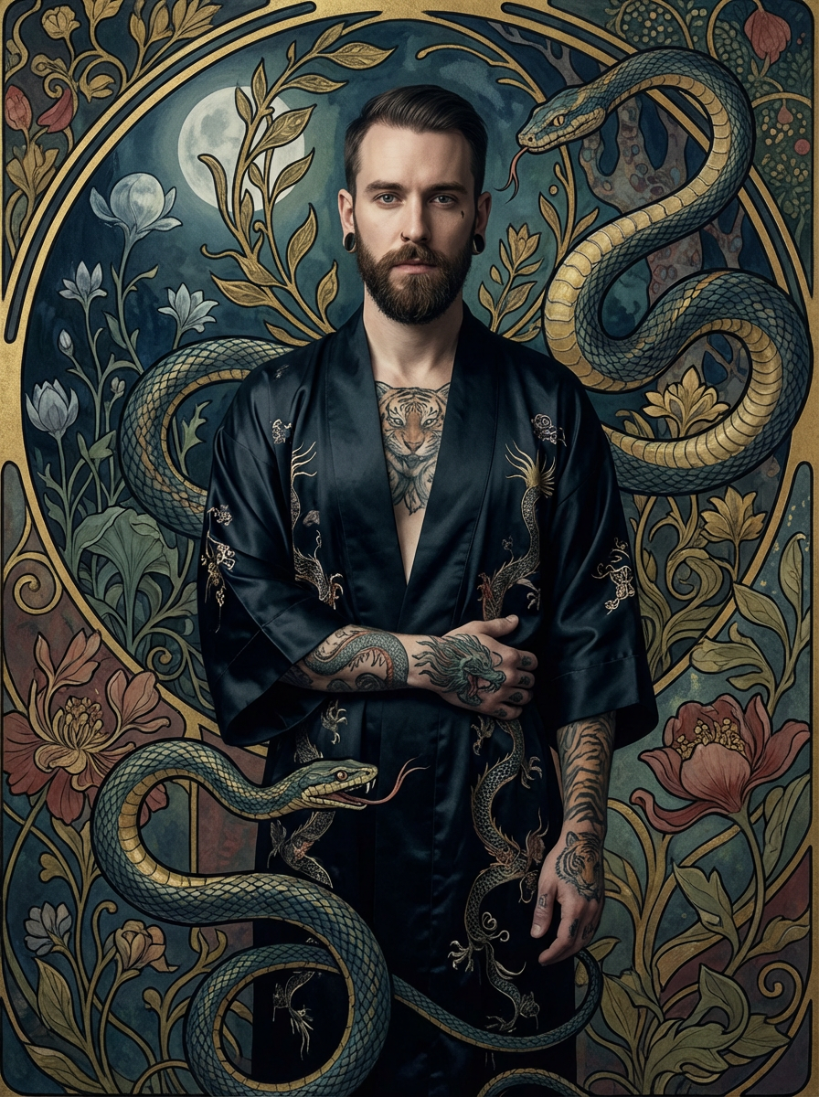 model with coiled serpents beautiful detailed romantic art nouveau of a model by alphonse mucha, kay nielsen, yoshitaka amano, and gustav klimt, hauntingly beautiful refined moody dreamscape