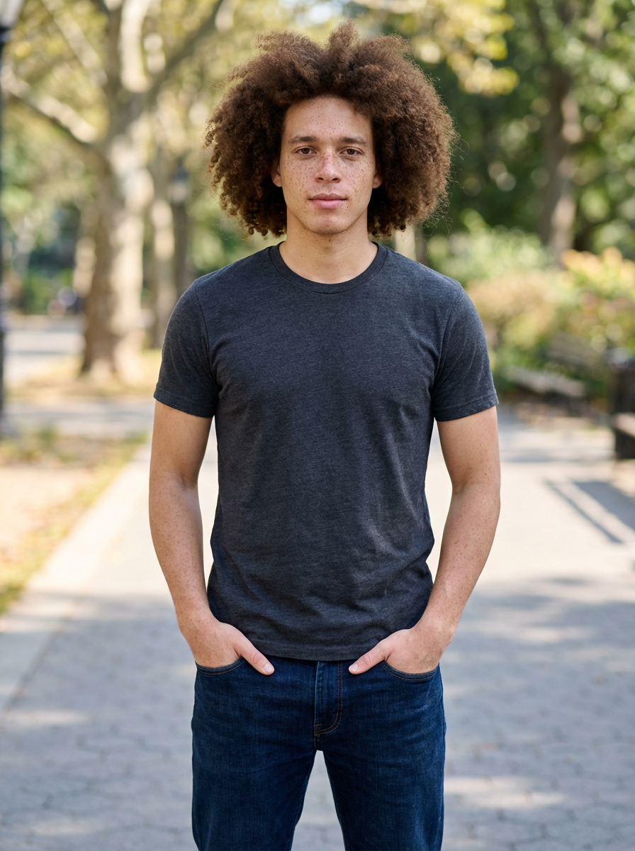 model with curly voluminous hair, defined curls, tight curls on top, natural lighting