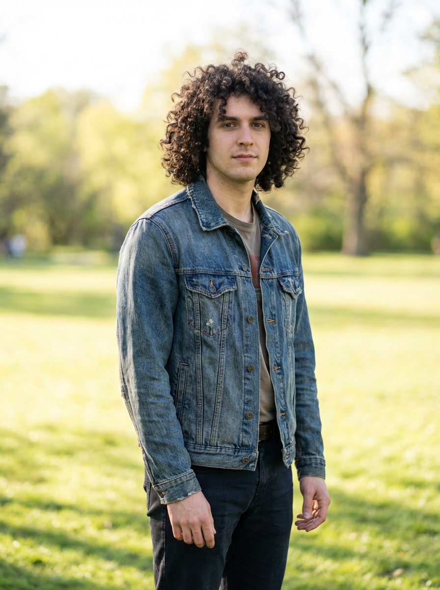 model with curly voluminous hair, defined curls, tight curls on top, natural lighting