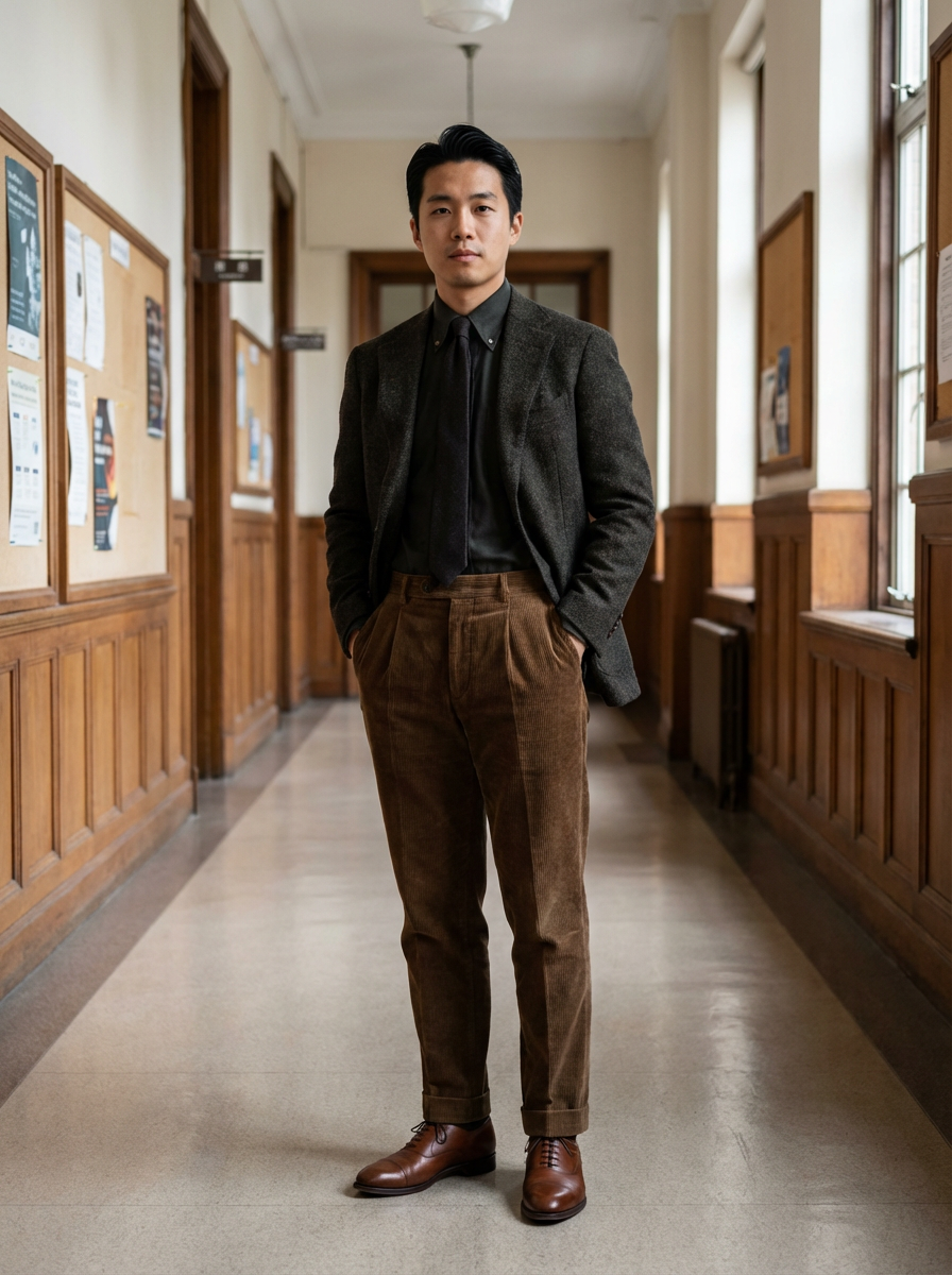 model with dark academia style, oxford shoes, pleated trousers, corduroy pants, university corridor setting