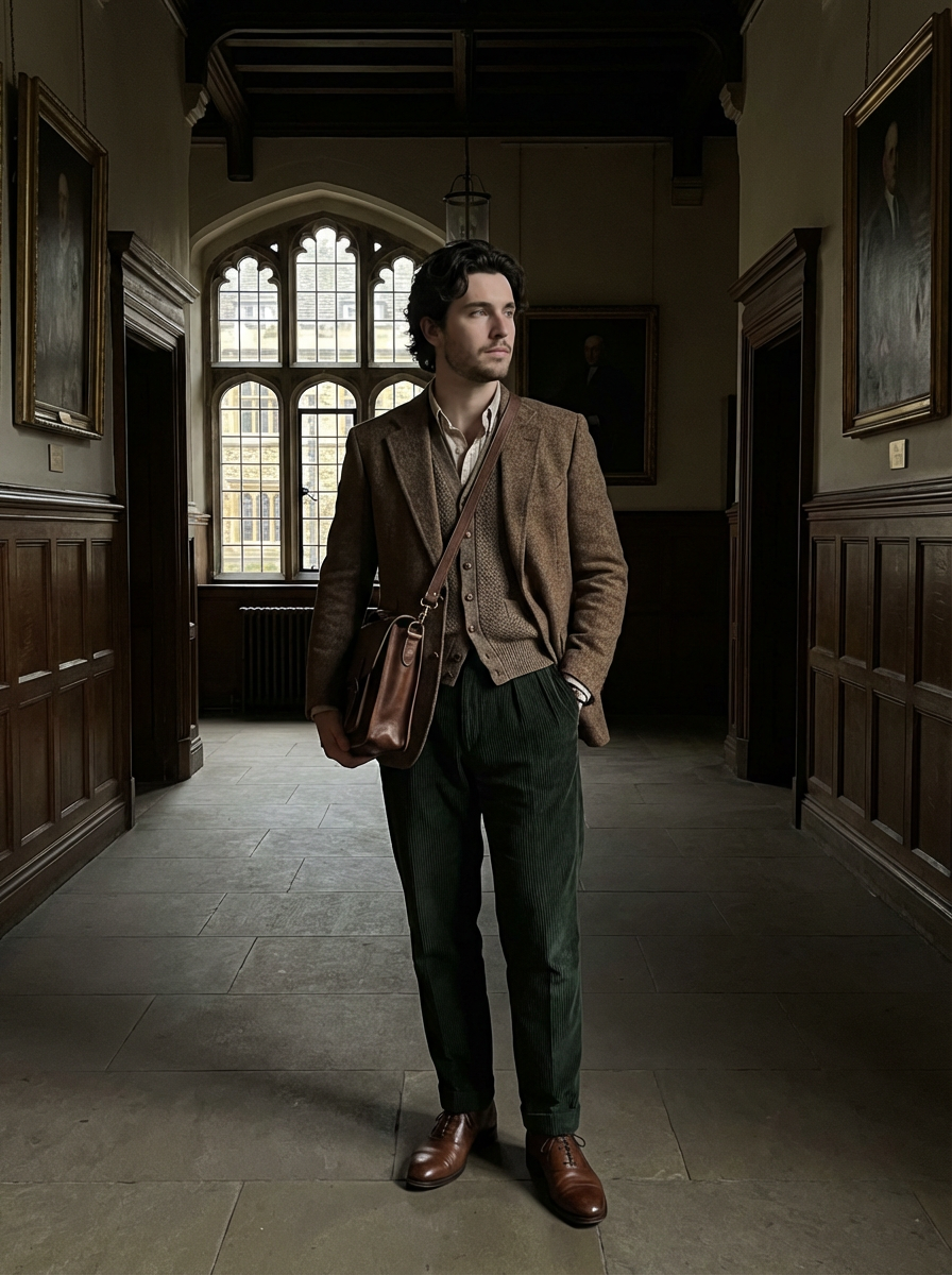 model with dark academia style, oxford shoes, pleated trousers, corduroy pants, university corridor setting