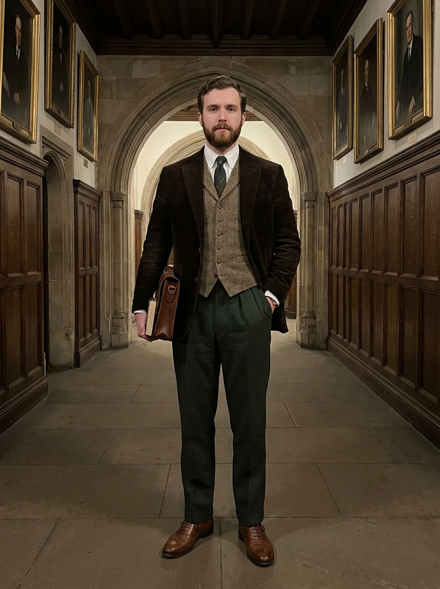 model with dark academia style, oxford shoes, pleated trousers, corduroy pants, university corridor setting