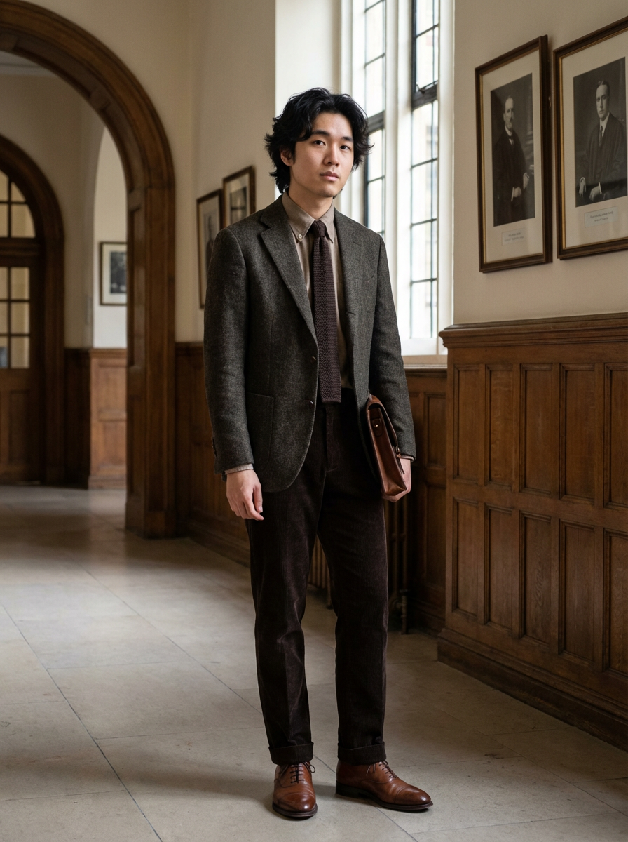 model with dark academia style, oxford shoes, pleated trousers, corduroy pants, university corridor setting
