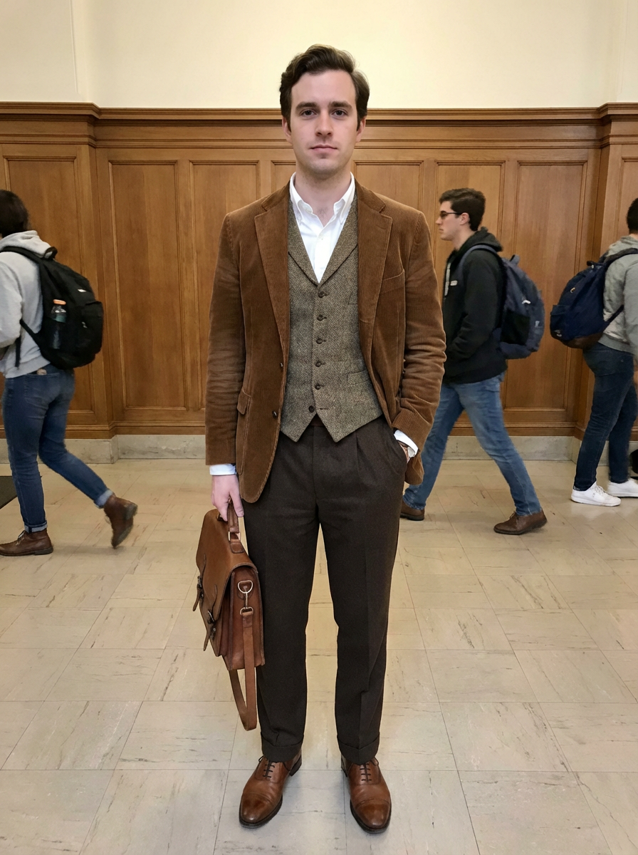 model with dark academia style, oxford shoes, pleated trousers, corduroy pants, university corridor setting