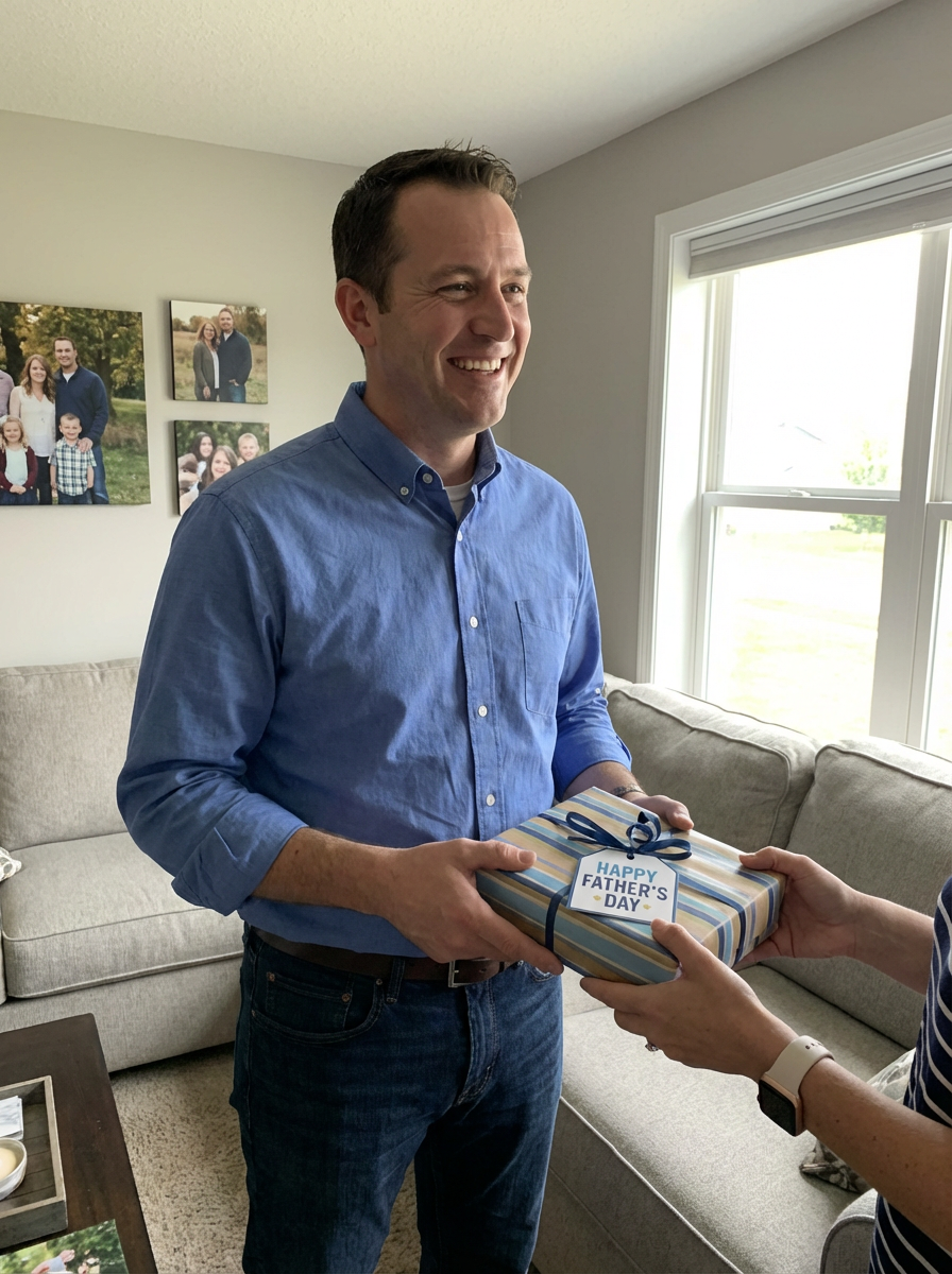 model with Fathers Day gift, wrapped present, receiving gift proudly, warm family setting