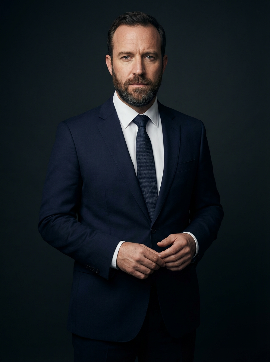 model with full thick beard, well-groomed and shaped, natural brown color, professional headshot lighting