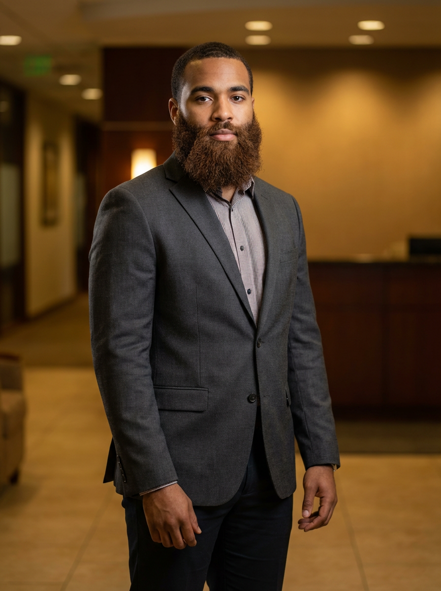 model with full thick beard, well-groomed and shaped, natural brown color, professional headshot lighting