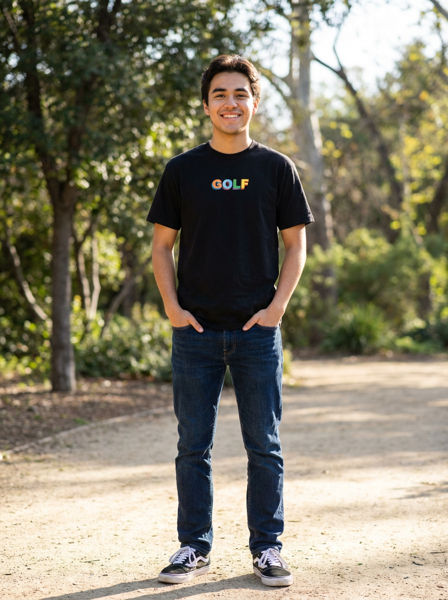 model with genuine warm smile, casual authentic outfit, natural outdoor setting, approachable friendly vibe