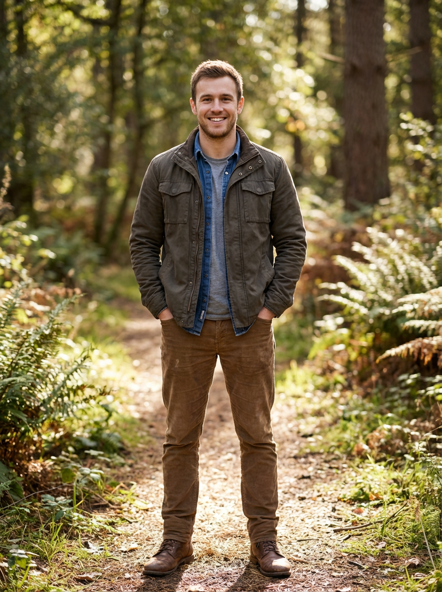 model with genuine warm smile, casual authentic outfit, natural outdoor setting, approachable friendly vibe