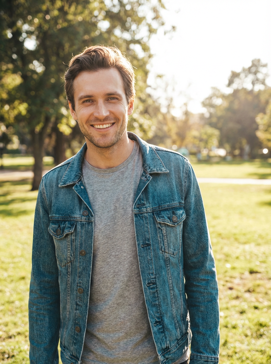 model with genuine warm smile, casual authentic outfit, natural outdoor setting, approachable friendly vibe