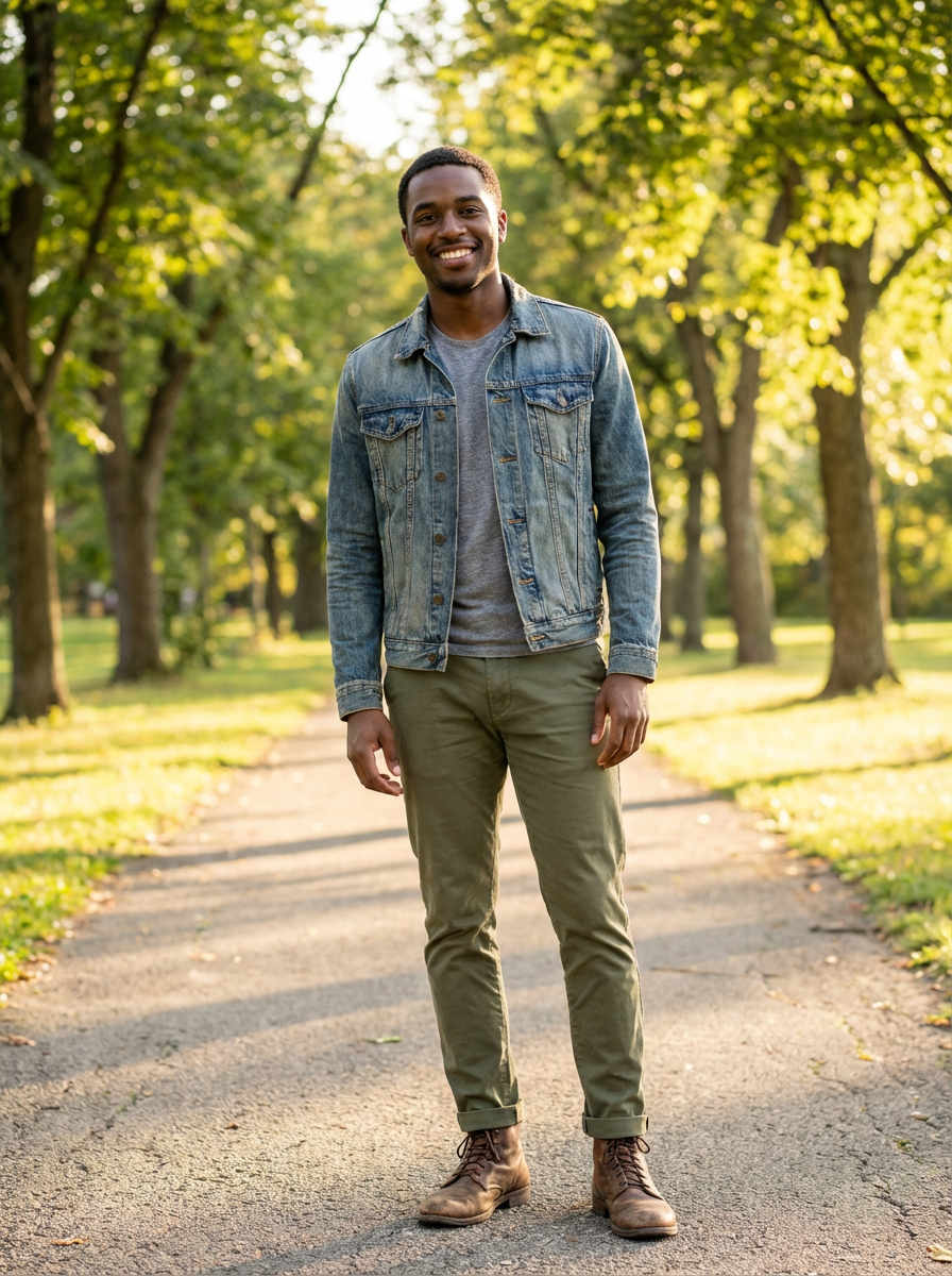 model with genuine warm smile, casual authentic outfit, natural outdoor setting, approachable friendly vibe