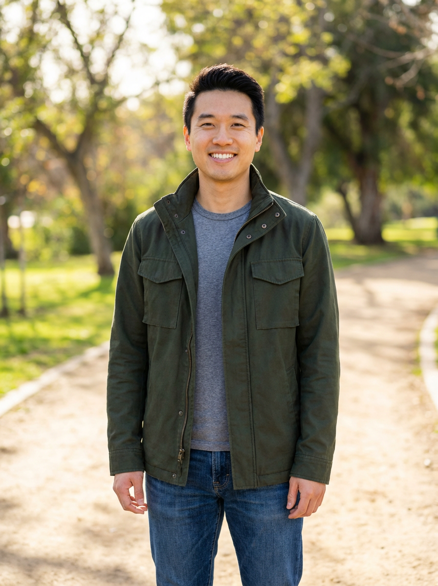 model with genuine warm smile, casual authentic outfit, natural outdoor setting, approachable friendly vibe