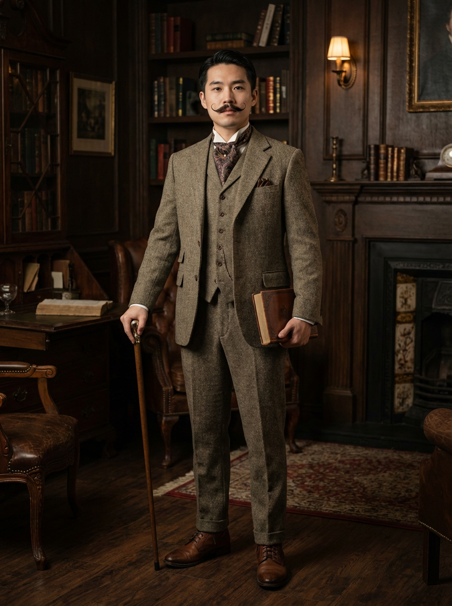 model with handlebar mustache, styled and waxed, vintage gentleman aesthetic