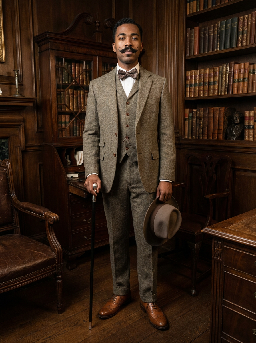 model with handlebar mustache, styled and waxed, vintage gentleman aesthetic
