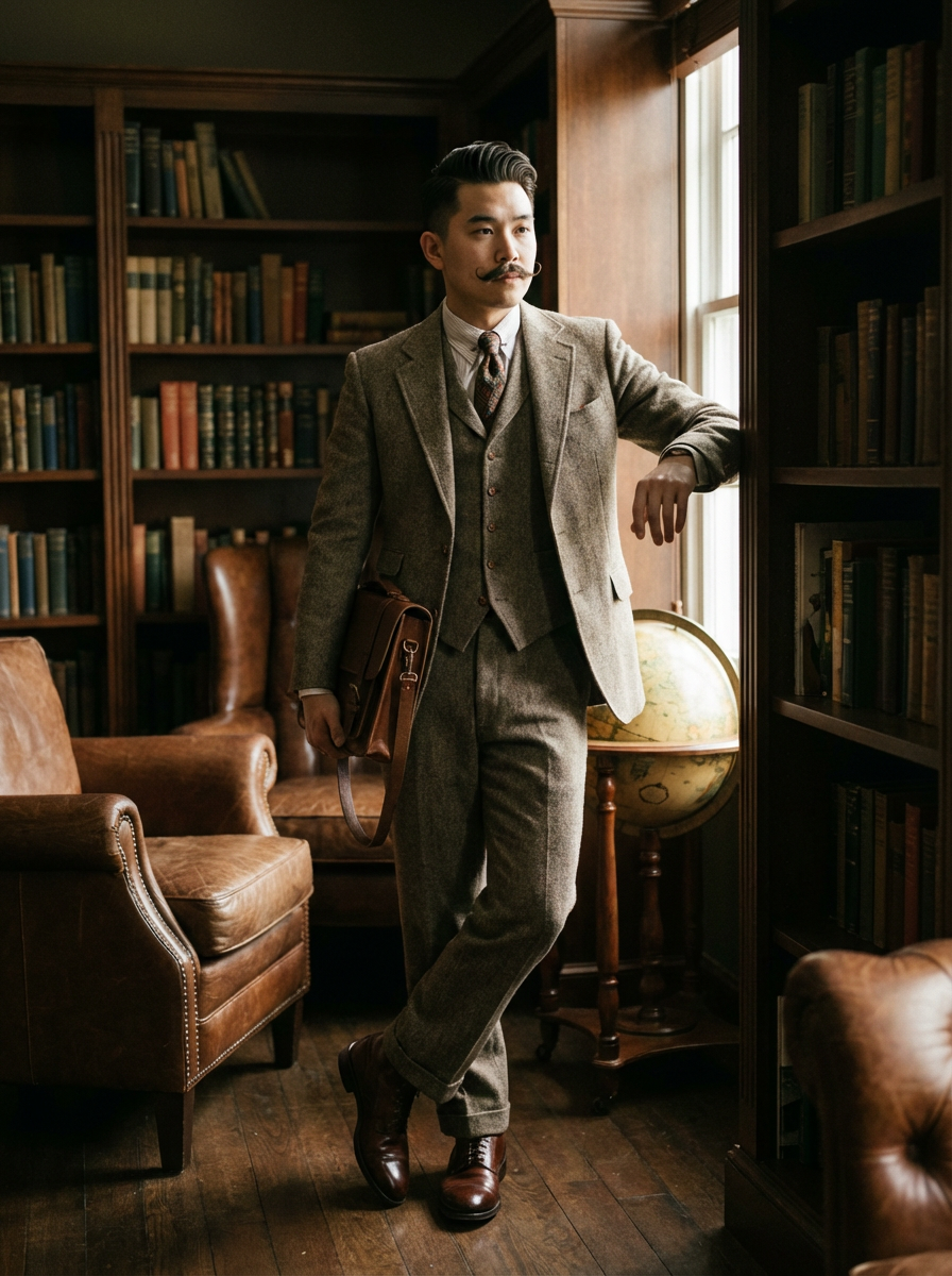 model with handlebar mustache, styled and waxed, vintage gentleman aesthetic